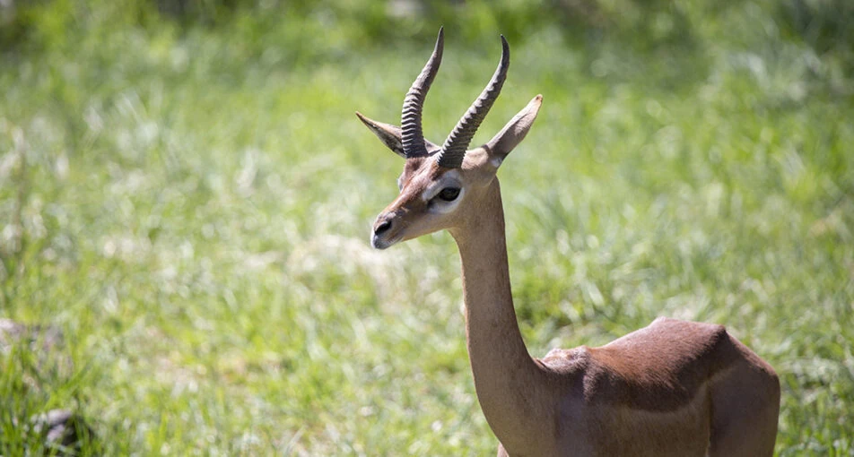 The gerenuk (Litocranius walleri), also known as the giraffe gazelle, is a long-necked, medium-sized antelope found in parts of East Africa. The sole member of the genus Litocranius, the gerenuk was first described by the naturalist Victor Brooke in 1879. It is characterised by its long, slender neck and limbs. The antelope is 80–105 centimetres (2 feet 7 inches – 3 feet 5 inches) tall, and weighs between 18 and 52 kilograms (40 and 115 pounds). Two types of colouration are clearly visible on the smooth coat: the reddish brown back or the "saddle", and the lighter flanks, fawn to buff. The horns, present only on males, are lyre-shaped. Curving backward then slightly forward, these measure 25–44 cm (10–17+1⁄2 in).