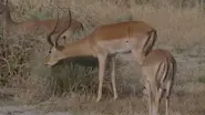 Active mainly during the day, the impala may be gregarious or territorial depending upon the climate and geography. Three distinct social groups can be observed: the territorial males, bachelor herds and female herds. The impala is known for two characteristic leaps that constitute an anti-predator strategy. Browsers as well as grazers, impala feed on monocots, dicots, forbs, fruits and acacia pods (whenever available). An annual, three-week-long rut takes place toward the end of the wet season, typically in May. Rutting males fight over dominance, and the victorious male courts females in oestrus. Gestation lasts six to seven months, following which a single calf is born and immediately concealed in cover. Calves are suckled for four to six months; young males—forced out of the all-female groups—join bachelor herds, while females may stay back.